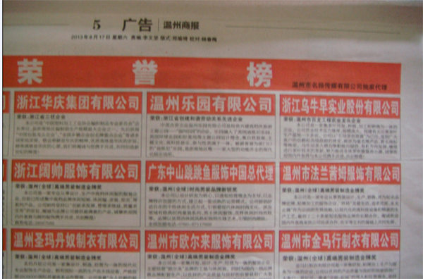 | 2013年8月17日在温州商报荣誉榜 | |||